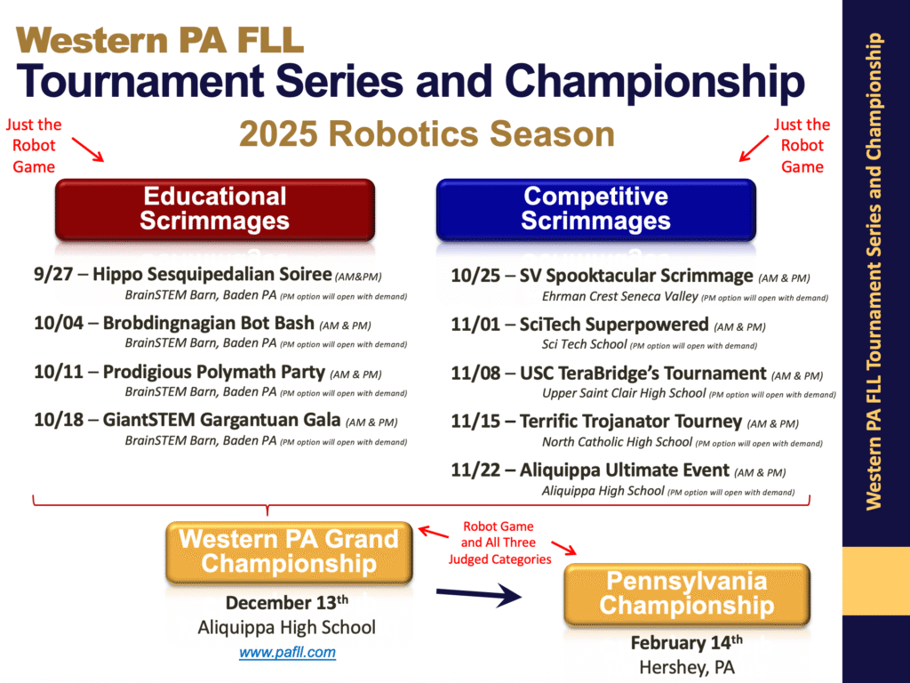 Let’s Go!! FLL returns again this fall in Western PA with a full season of Educational Scrimmages, Competitive Scrimmages, a full-scale Western PA Grand Championship Tournament, and the prestigious PA State Championship!